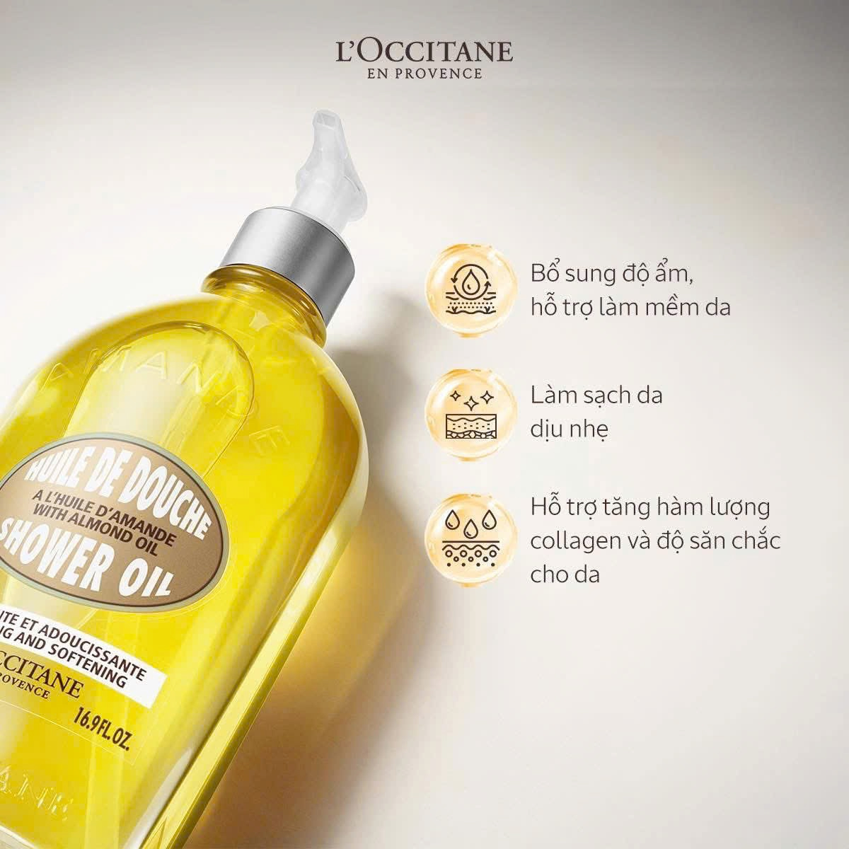 - Dầu dưỡng thể L’Occitane Almond Supple Skin Oil: bổ sung dưỡng chất, khóa ẩm và mang lại làn da mềm mại, săn chắc sau khi tắm.