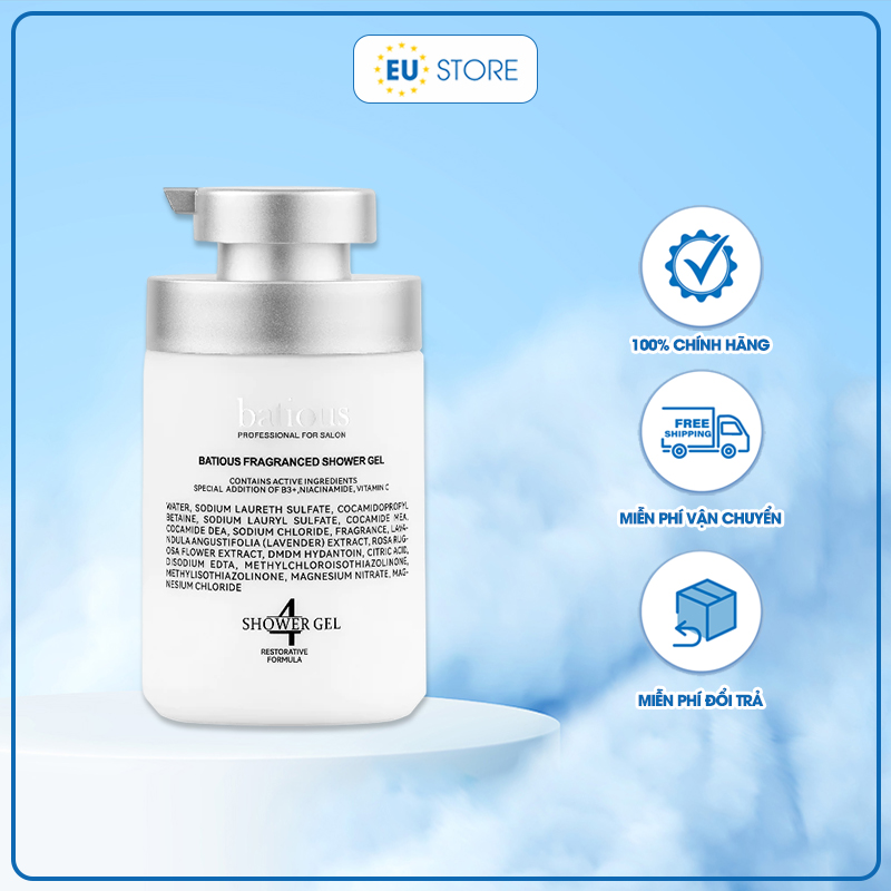 Sữa tắm trắng da Batious Fragranced Shower Gel giúp làm sạch sâu và dưỡng sáng da nhẹ nhàng. Với thành phần Niacinamide và chiết xuất thiên nhiên, sản phẩm mang lại làn da mềm mịn, đều màu và ngừa mụn lưng hiệu quả. Hương thơm tinh tế lưu lại lâu, tạo cảm giác thư thái sau mỗi lần tắm. Được tin dùng tại các salon, spa cao cấp.