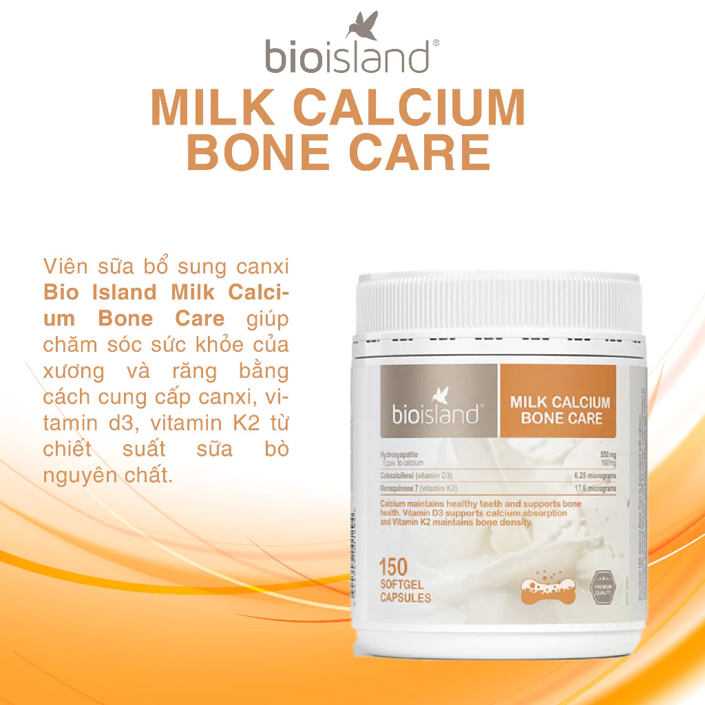 Bio Island Milk Calcium Bone Care 150 viên – Canxi sữa kết hợp D3 & K2 hỗ trợ xương chắc khỏe